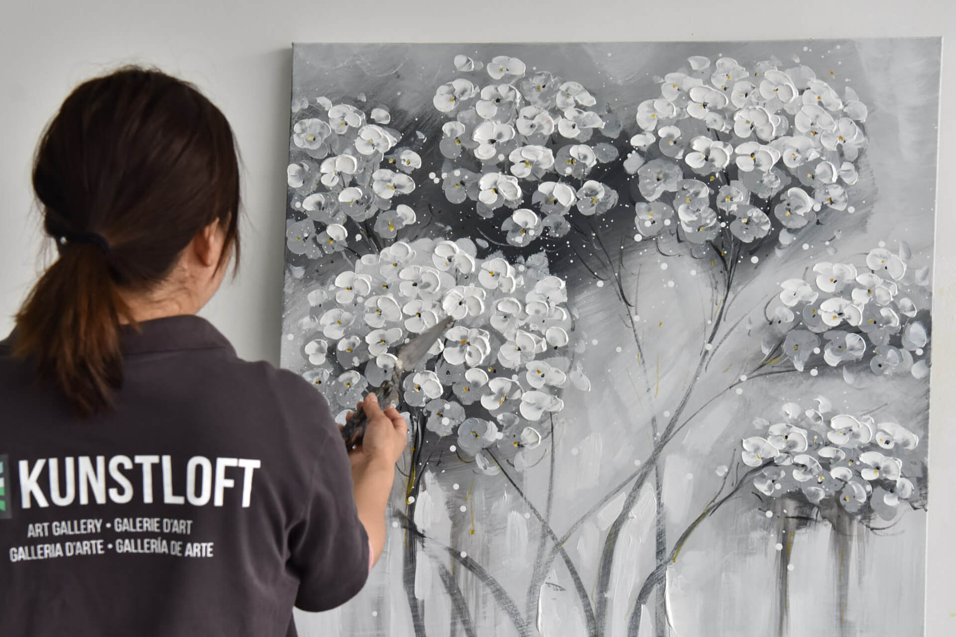 Die Blumen in 'Weiße Unschuld' strahlen eine kühle Eleganz aus. Durch die Farbwahl aus Grau und Weiß wirkt es, als läge eine Eisschicht über dem Motiv, einzig durch orange Farbtupfer durchbrochen. Dieses handgemalte Ölbild ist Ausdruck eines zeitlosen Einrichtungsstils und erfreut Sie jeden Tag in Ihrem Wohnzimmer oder Hotel. Ihr handgemaltes Gemälde erhalten Sie in der Größe 80x80cm. Anders als bei minderwertigen Drucken auf Leinwand können Sie auf unseren Unikaten jeden Pinselstrich fühlen. 0 Oil painting 1 Ölgemälde Handmade Quality 2 2 0