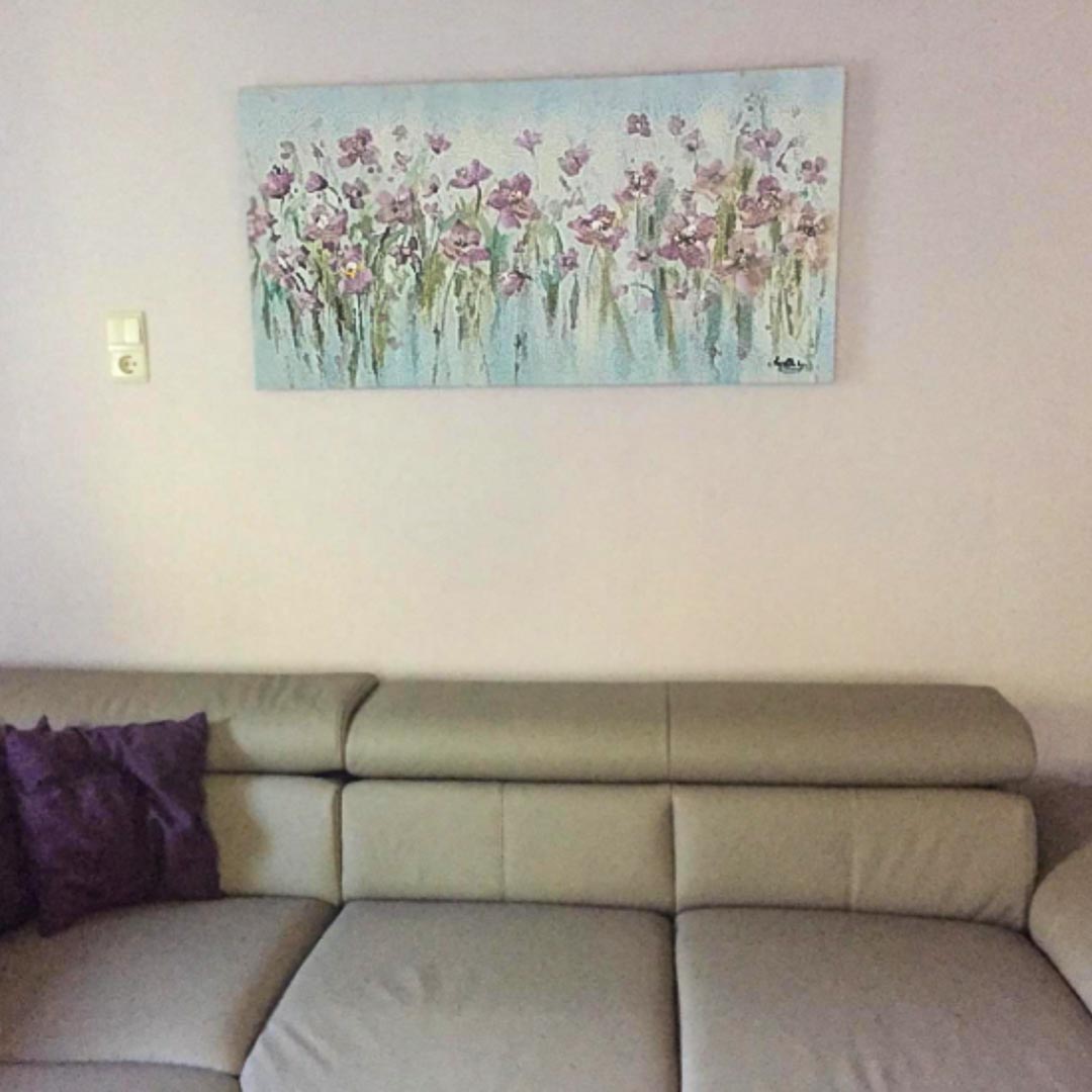 Dieses handgemalte Ölbild mit Papierelementen zeigt lilafarbene Blüten, die sich auf der Leinwand mit Glitter und Goldglanz emporrecken. Die Köpfe, die sich in unterschiedliche Richtungen neigen, lassen den Eindruck von Lebendigkeit entstehen. Das Gemälde 'Perfect Scenery' wirkt wie ein kleiner Garten im heimischen Esszimmer. Ihr handgemaltes Gemälde erhalten Sie in der Größe 120x60cm. Anders als bei minderwertigen Drucken auf Leinwand können Sie auf unseren Unikaten jeden Pinselstrich fühlen. 0 Oil painting 1 Ölgemälde Handmade Quality 2 2 0