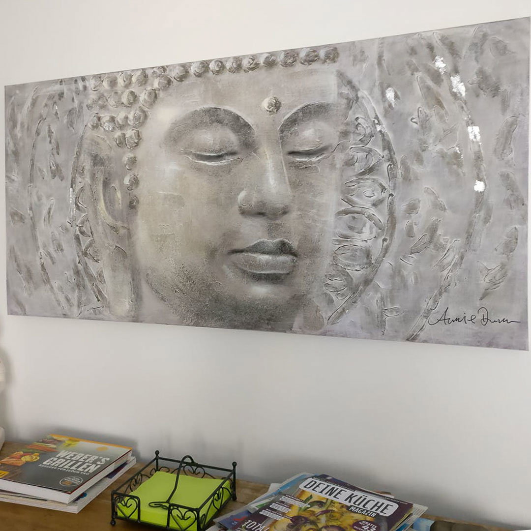 Wie die Detailaufnahme einer traditionellen Buddha-Statue erscheint 'Find your Inner Peace'. Durch das künstlerische Spiel mit Grautönen und Kunststoffelementen lässt der Künstler das Gesicht auf diesem handgemalten Acrylbild dreidimensional und realistisch wirken. Das Gemälde mit Silberglanz schafft einen Ruhepol in Ihrem Wohnzimmer. Ihr handgemaltes Gemälde erhalten Sie in der Größe 120x60cm. Anders als bei minderwertigen Drucken auf Leinwand können Sie auf unseren Unikaten jeden Pinselstrich fühlen. 0 Canvas pictures 1 Acrylgemälde Handmade Quality 2 2 0