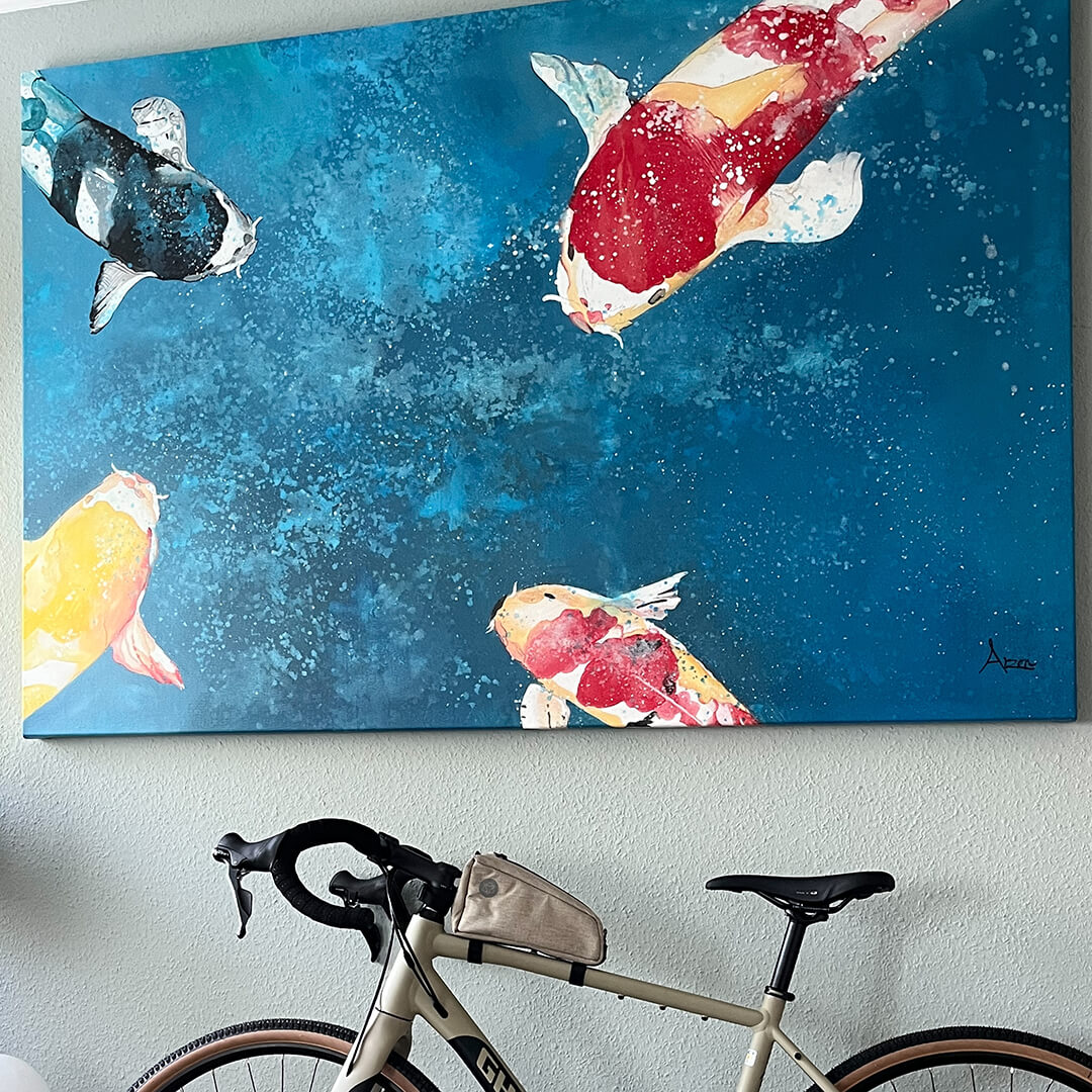 In een ontspannen sfeer vindt in 'Vibrant Serenity' een bijeenkomst plaats van vier koikarpers. Met de hand geschilderde kleurstippen op blauw doek vormen de habitat van de kleurrijke vissen op het grootformaat olieverfschilderij. De kunstenaar Arzen schept met de sculpturaal uitgebeelde dieren een beeld van de oorspronkelijke eenvoud.