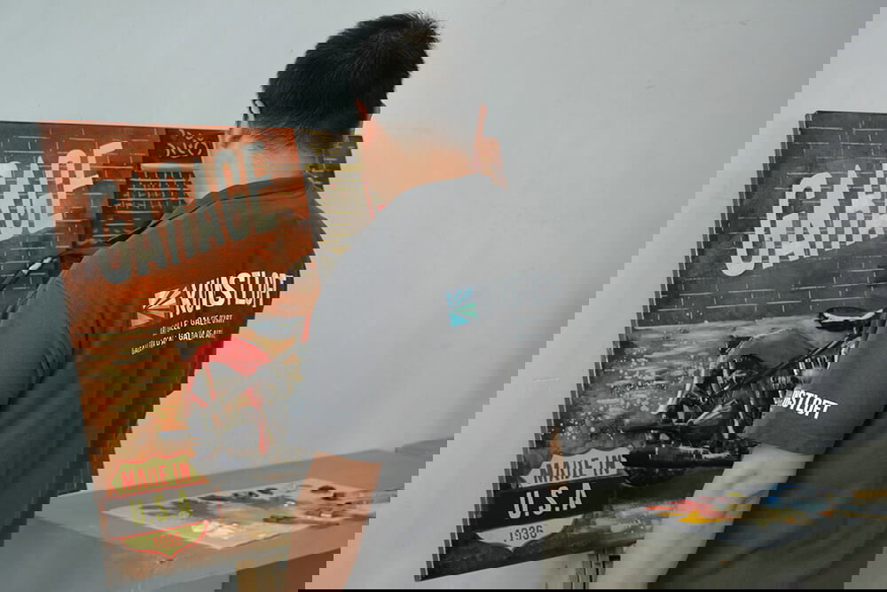 Als een trofee van overwinningswedstrijden staat de motor in de garage. Het handgemaakte metalen plaatje maakt indruk met nostalgische flair en brengt de gevoelens van vrijheid en adrenalinekick die je met zo'n machine associeert in je woonkamer. Rood en bruin zorgen samen voor een warm kleurenspel en geven de fiets een expressie van vurige energie, wat in het voordeel is van de 'Race for Victory'.