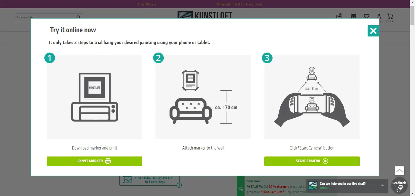 - Digitale sjablonen: KunstLoft biedt een gratis online ophangapplicatie in 3 stappen waarmee je kunt testen en uitproberen hoe je schilderijen eruit zullen zien in de door jou gekozen ophangruimte.